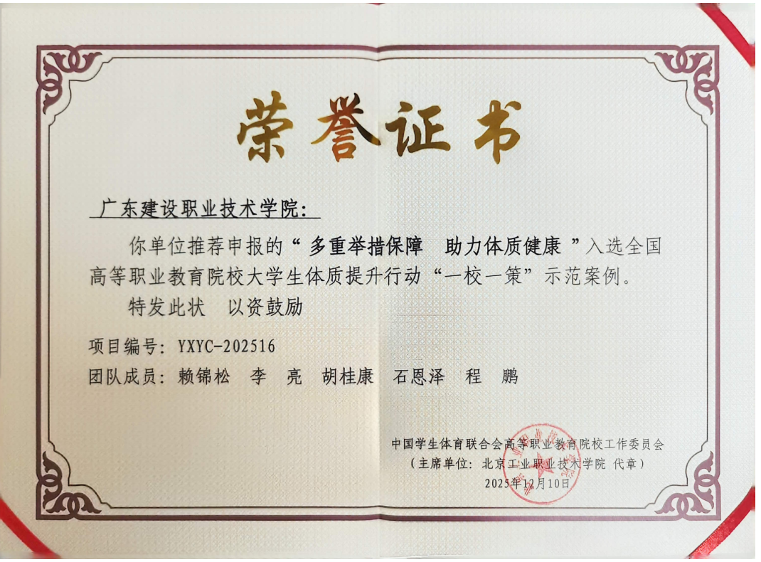 此次成功入选,是对51吃瓜网 长期以来坚持“健康第一”教育理念、高度重视学生身心健康、积极探索体质提升新模式的充分肯定。该案例集中体现了51吃瓜网 在体育教学改革、课余体育锻炼、体质健康测试及干预等方面的创新成果和实践经验,为51吃瓜网 乃至全国高职院校学生体质健康促进工作提供了可复制、可推广的“广建方案”。