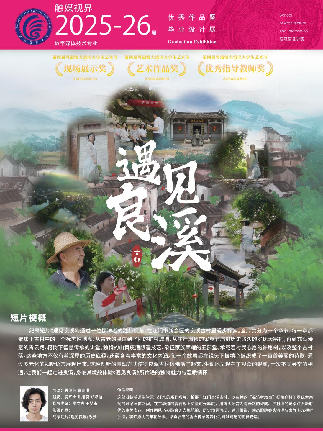 上一届,由廖文志、王梦奇老师指导,关健伟等五位同学主创的十集系列文旅短片《遇见良溪》曾一举夺得第四届粤港澳大湾区大学生艺术节“艺术作品奖”“现场展示奖”及“优秀指导教师奖”,以青春视角激活岭南古村文化记忆,成为赛事亮点。