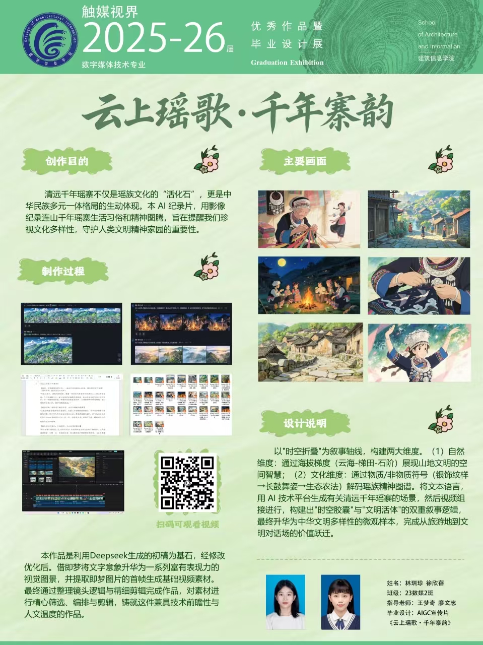 本届,AIGC文旅宣传片《云上瑶歌·千年寨韵》延续了建筑信息学院“知行合一”的艺术教育路径,进一步拓展了数字技术在文化遗产保护与传播中的应用实践。指导老师廖文志表示:“我们鼓励学生走出课堂,用技术讲述文化故事。连续两年入围艺术节,是对师生团队持续探索的肯定。” 据悉,该影片已获第十届广东高校网络媒体展示节动画短片类作品一等奖,并由广东省教育厅推送参加教育部主办的第八届全国大学生网络文化展示节活动。
