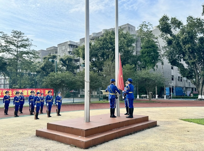 随着朝阳升起,国旗护卫队迈着整齐的步伐护送国旗入场。在激昂的国歌声中,五星红旗冉冉升起,全体师生行注目礼,目光中饱含着对祖国的热爱和对时代使命的坚定。