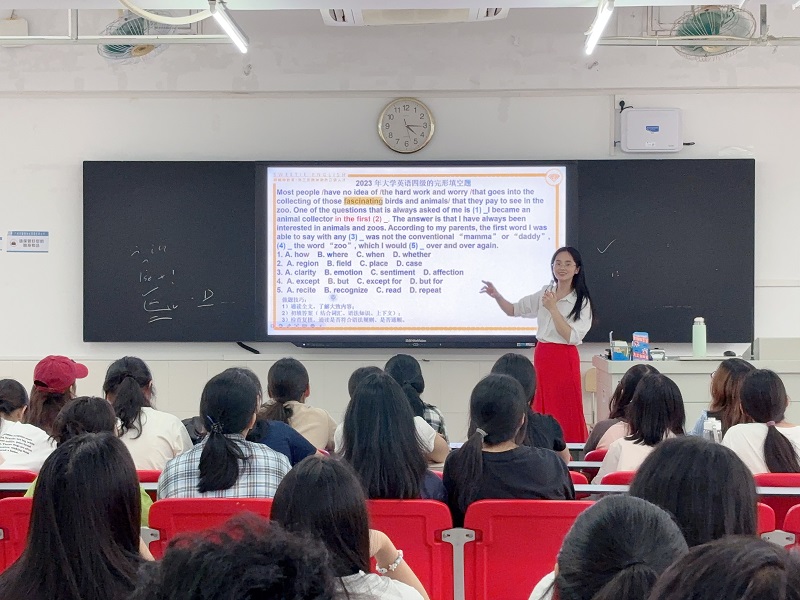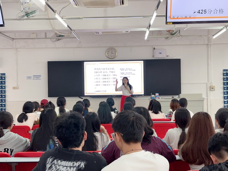 讲座特邀斯威特教育集团创始人、国家高级演讲师林笑微老师主讲。林老师用英语生动讲述党史故事,从嘉兴南湖红船启航到长征精神,再到改革开放,让同学们在学习英语的同时,深刻感受党的伟大精神。随后,她结合四六级考试题型,分享听力、阅读、写作和翻译的实用技巧,现场互动热烈。