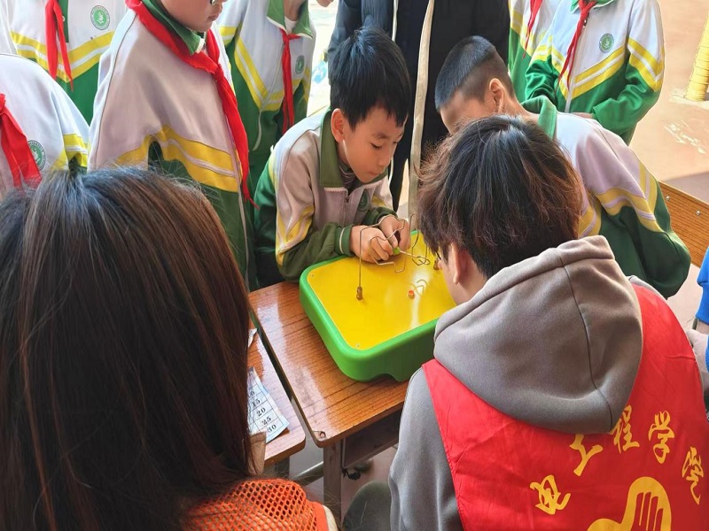 为了让修实小学的科技节充满惊喜与收获,志愿者们将专业的机电知识拆解、转化,精心设计成一个个趣味满满的互动游戏——从能量转化的手摇发电机,到考验专注力的“手不能抖”金属轨道,再到揭秘磁场奥秘的悬浮铅笔、承载梦想的自制小火箭,每一个项目都藏着志愿者们的巧思与用心,只为让孩子们在玩乐中感受科学的魅力。