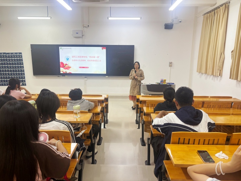 章鸿雁以《弘扬伟大抗战精神,砥砺青春报国之志》为题进行授课。她引导同学们从历史回望中思考个人成长与民族命运的联系,生动解读了伟大抗战精神的深刻内涵,并强调其在当下的传承价值与现实意义。课程结合建筑行业发展趋势,激励学生将精神信念转化为自我追求和报国行动。在寄语环节,她希望同学们立志做新时代好青年:胸怀家国,做有“根”的人;不畏艰难,做有“勇”的人;笃实力行,做有“为”的人。