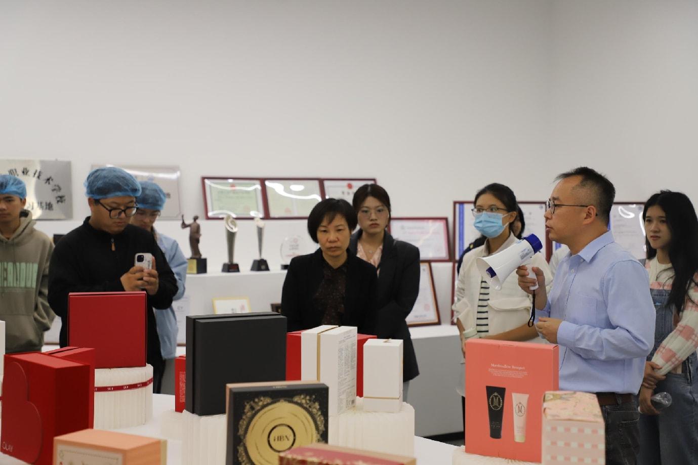 10月21日上午,师生首站走进广东恒远包装科技有限公司。在技术总监的引导下,同学们依次参观智能包装生产线、数字化质控中心与企业专利墙,从原料自动分拣到成品智能打包,全程自动化运作生动展现了“科技赋能制造”的澎湃动力。座谈中,企业代表分享了日化、食品等领域的包装设计案例与绿色材料研发成果,同学们围绕“智能制造与可持续发展”展开热烈探讨。